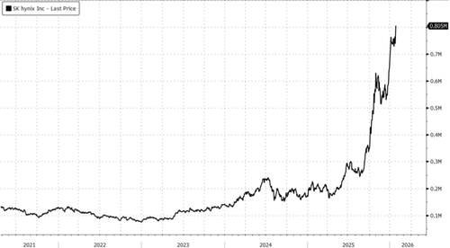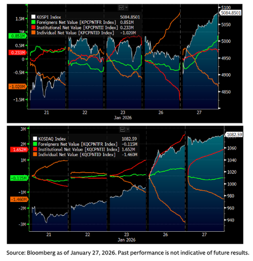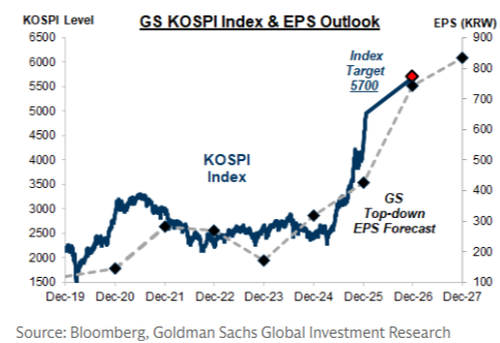 More broadly, KOSPI made a "clear breakout above 5,000 and closed @ 5,085 today, marking YTD growth of +21%," Goldman analyst Heather Oh told clients earlier.