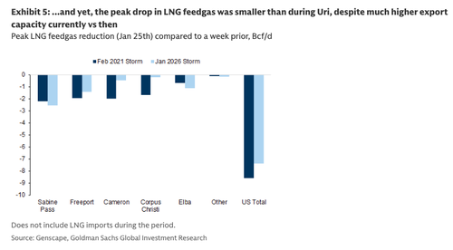 The beat in LNG feedgas demand has been particularly surprising in our view given the growth in US LNG export capacity in recent years, which would have allowed higher gas re-sales from US liquefaction facilities to the grid vs what we observed during the Winter Storm Uri, in 2021. In particular, the reported peak in production freeze-offs during Fern was comparable to Uri's, and cash gas prices, higher ahead of Fern ($28/mmBtu) than during Uri ($24/mmBtu) (Exhibit 3 and Exhibit 4). Yet, the peak drop in LNG feedgas was smaller now, at 7.4 Bcf/d (38% of capacity) on Jan 25, vs 8.6 Bcf/d (74% of capacity) at its Feb 2021 peak[1] (Exhibit 5).