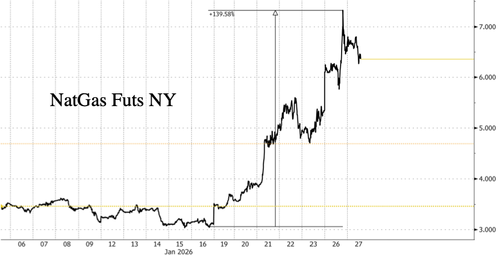 Natural gas futures in New York reversed lower Tuesday morning after a historic eight-day rally that saw prices surge roughly 140%, as an Arctic blast and winter storm triggered widespread freeze-offs and curtailed production across major hubs in the eastern half of the US.