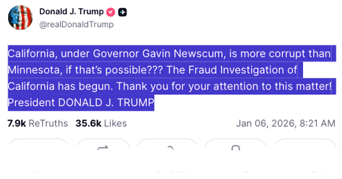 "California, under Governor Gavin Newscum, is more corrupt than Minnesota, if that's possible??? The fraud investigation of California has begun. Thank you for your attention to this matter!" Trump wrote on Truth Social on Tuesday.